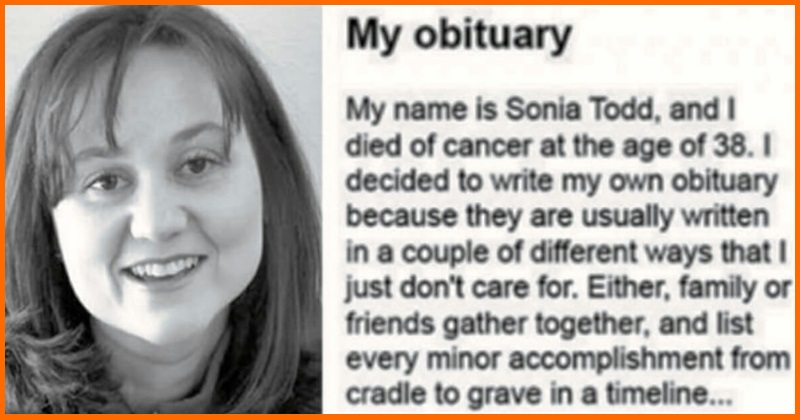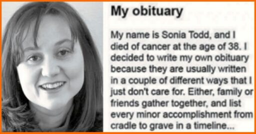 Sonia Todd of Moscow, Idaho, died of most cancers on the younger age of 38. However understanding the top was close to, she determined to write down her personal obituary earlier than passing away. As she defined, obituaries have been normally written a few totally different ways in which she merely didn’t take care of. So, as considered one of her final acts on this earth, she put pen to paper and determined for herself how her obituary would learn.
