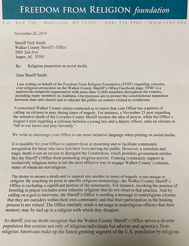 “The problem right here is that the sheriff’s workplace has a sample of utilizing tragedy to advertise the thought of prayer and our letter reminds the sheriff, not everybody in Walker County prayers or believes in the identical faith,” FFRF affiliate counsel Sam Grover wrote in a letter accusing the sheriff of disregarding the Structure. “It’s laudable to your Workplace to assist these in mourning and to facilitate group recognition for many who have misplaced their lives serving the general public. Nevertheless, a mindless and tragic dying is just not an excuse to ignore the Structure, which prohibits authorities entities just like the Sheriff’s Workplace from selling non secular exercise.”