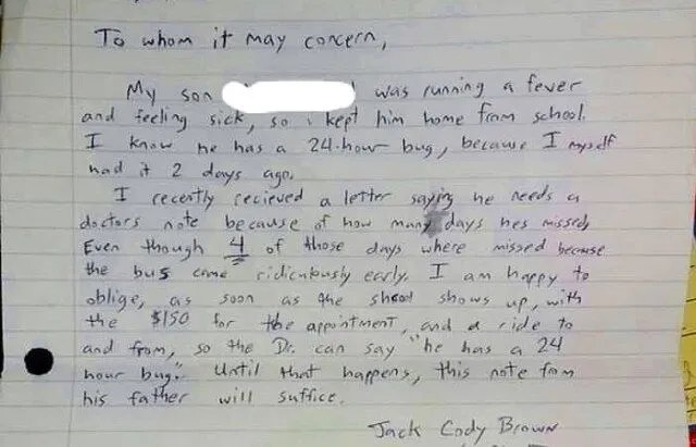 “To whom it could concern,” the letter begins, “My son was working a fever and feeling sick, so I stored him dwelling from college. I do know he has a 24-hour bug, as a result of I actually had it 2 days in the past. I lately acquired a letter saying he wants a physician’s be aware due to what number of days he’s missed, regardless that 4 of these days have been missed as a result of the bus got here ridiculously early. I’m completely satisfied to oblige as quickly as the varsity exhibits up with the $150 for the appointment and a trip to and from, so the dr. can say, ‘he has a 24-hour bug.’ Till that occurs, this be aware from his father will suffice.”