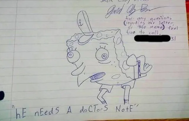 Brown then ended his letter by exhibiting off his creative expertise with a hand-drawn portrait of a satirical meme. On the backside of the web page, he included an outline of the favored youngsters’s cartoon character Spongebob Squarepants posing sarcastically with the caption “He wants a physician’s be aware.”